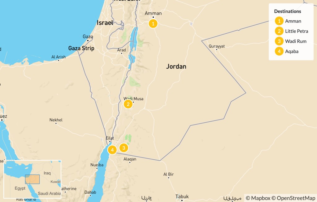 Map of Active Adventure in Jordan: Wadi Mujib, Petra, Wadi Rum, Aqaba – 5 Days
