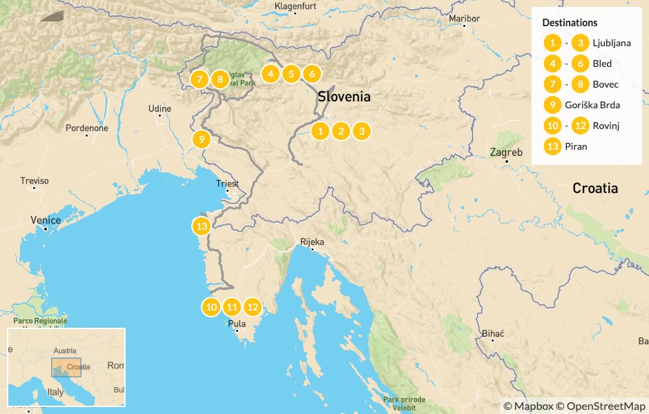 Map of Active Adventure in Slovenia and Istria: Ljubljana, Lake Bled, Bovec, & Rovinj – 14 Days