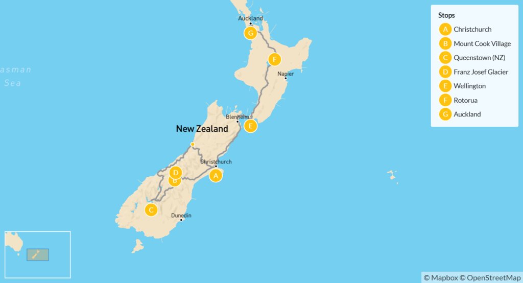 Map of Active Adventure on New Zealand’s North & South Islands – 16 Days