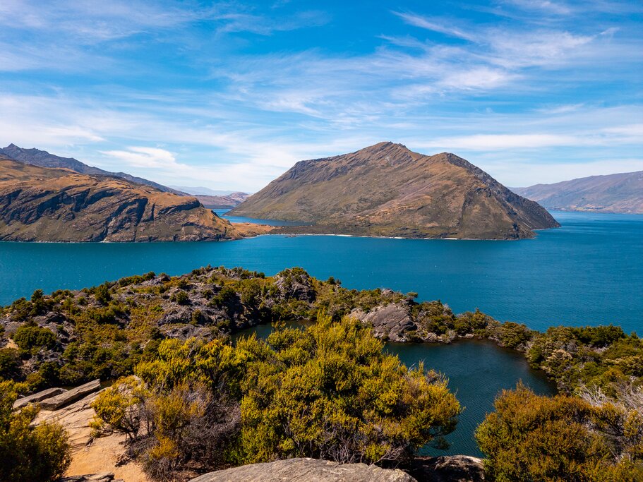 After your arrival, check off a must-do Wānaka attraction: a visit to the Mou Waho Island Nature Reserve. The island is one of five in Lake Wānaka, accessed via a 35-minute boat ride. It’s a scientific reserve and home to native New Zealand wildlife. Mou Waho’s most notable feature is Arethusa Pool. This small lake on the island has its own island within—you can catch the best views of this island-on-a-lake-inside-an-island-on-a-lake from the top of Tyrwhitt Peak on Mou Waho. You’ll also get beautiful panoramic views of Lake Wānaka and the surrounding glacial mountains and valleys.