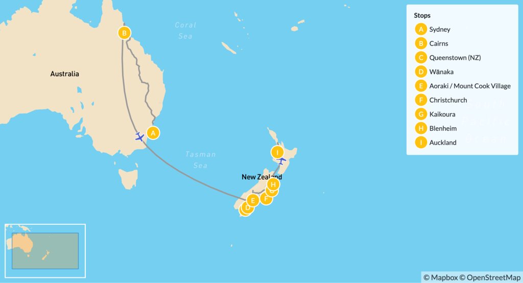Map of Active Adventures in Australia & New Zealand: Sydney, Cairns, Queenstown, Christchurch & Auckland – 21 Days T440