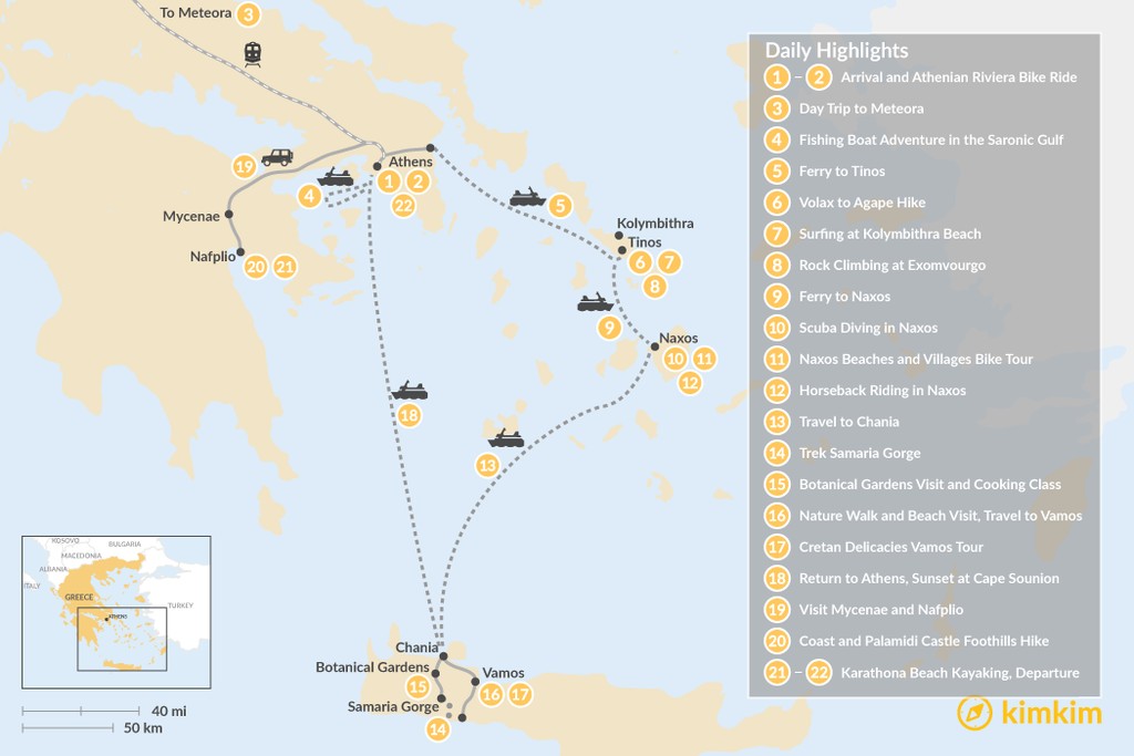 Map of Active Athens, Mainland Greece, Cyclades, and Crete – 22 Days