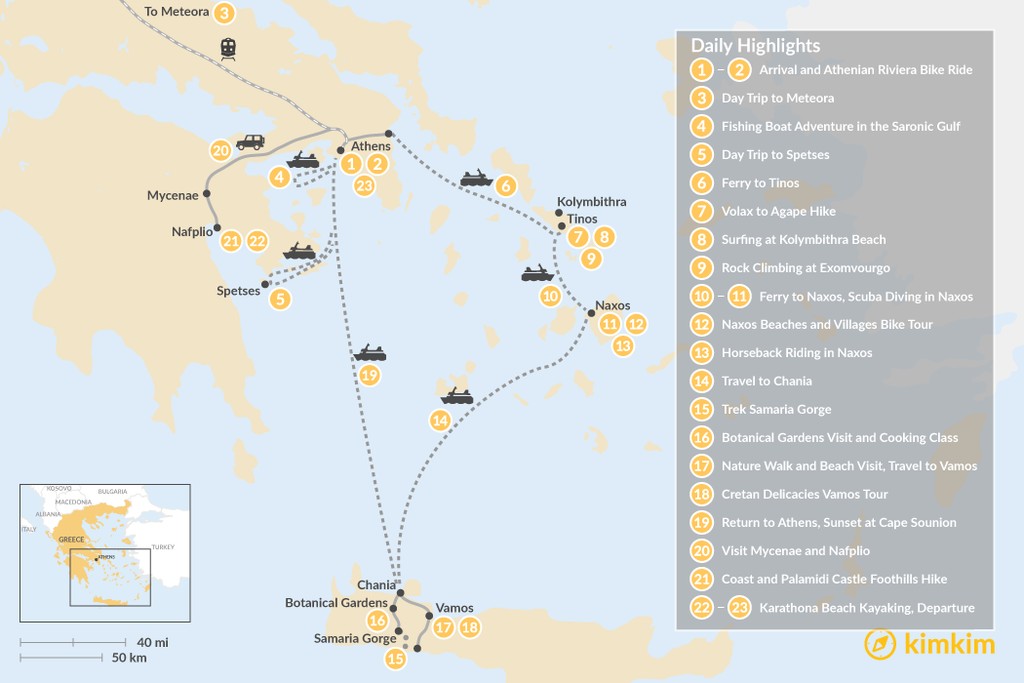 Map of Active Athens, Mainland Greece, Cyclades, and Crete – 23 Days