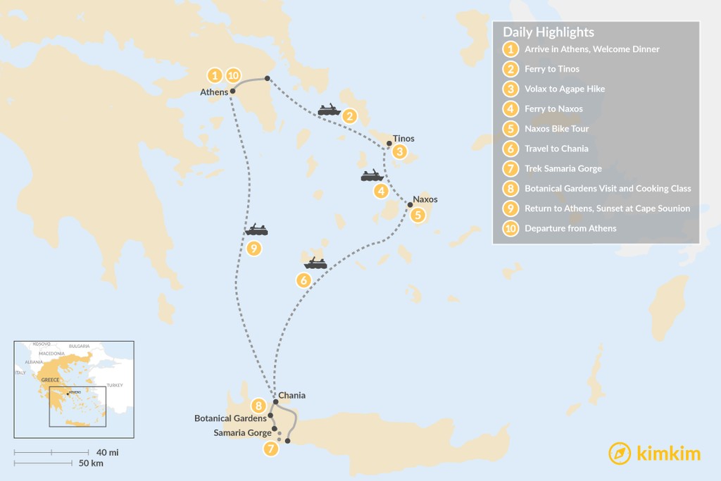 Map of Active Athens, Tinos, Naxos, and Crete – 10 Days