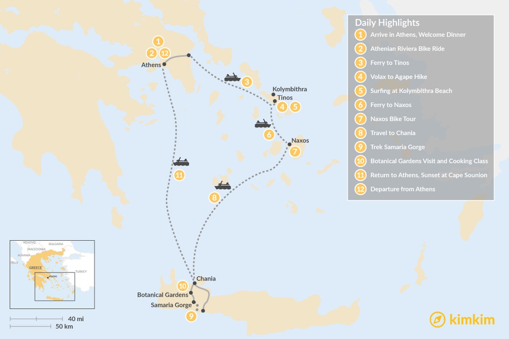 Map of Active Athens, Tinos, Naxos, and Crete – 12 Days
