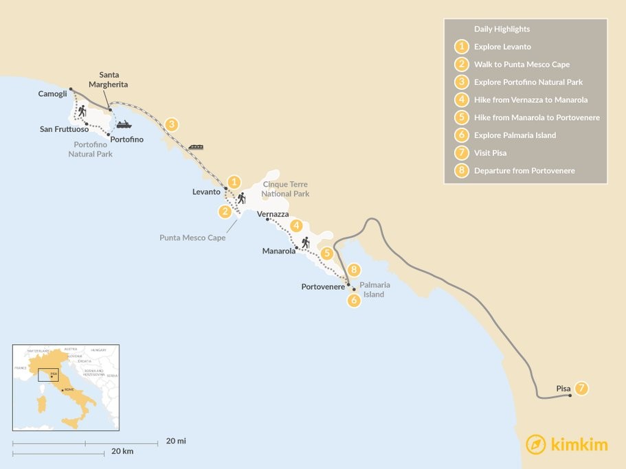 This one week tour of National Park of Cinque Terre lets you explore this UNESCO heritage site in all its glory. This is a unique area where houses are painted in vivid multi-colored shades and the sea is brighter than the sky. The hiking routes consist of ancient paths and mule tracks. Short train rides connect its five classic colorful fishing villages.