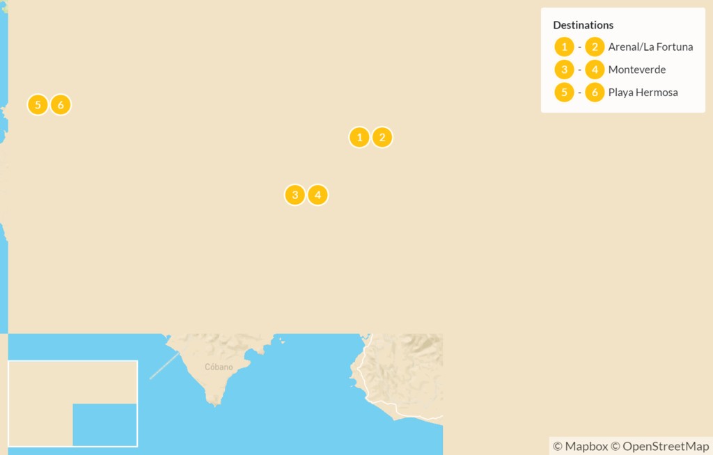 Map of Active Costa Rica Adventure: Arenal, Monteverde, & Playa Hermosa – 7 Days