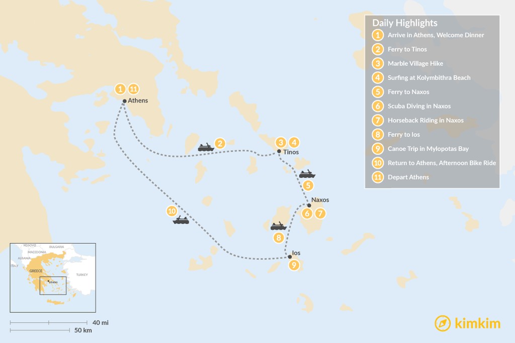 Map of Active Cyclades: Tinos, Naxos & Ios – 11 Days