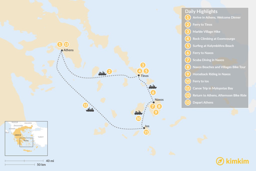Map of Active Cyclades: Tinos, Naxos & Ios – 13 Days