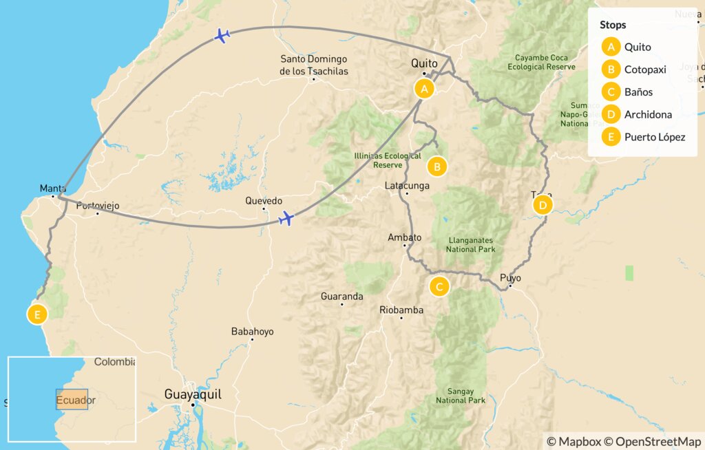 Map of Active Ecuador Highlands Adventure: From the Amazon to the Beach – 16 Days