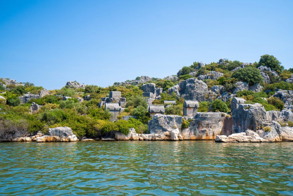 Venture back down the hill to continue the drive, making another stop at the ancient city of Myra, built in the second century BCE. Wander through this archaeological wonder, admiring the well-preserved rock-cut tombs adorning the cliff faces. Explore the Roman theater, agora, and St. Nicholas Church, believed to be the final resting place of the saint who inspired the story of Santa Claus. After walking through the remains of this once-prosperous city, finish the drive to Kaş and check into your hotel to relax after your road trip.