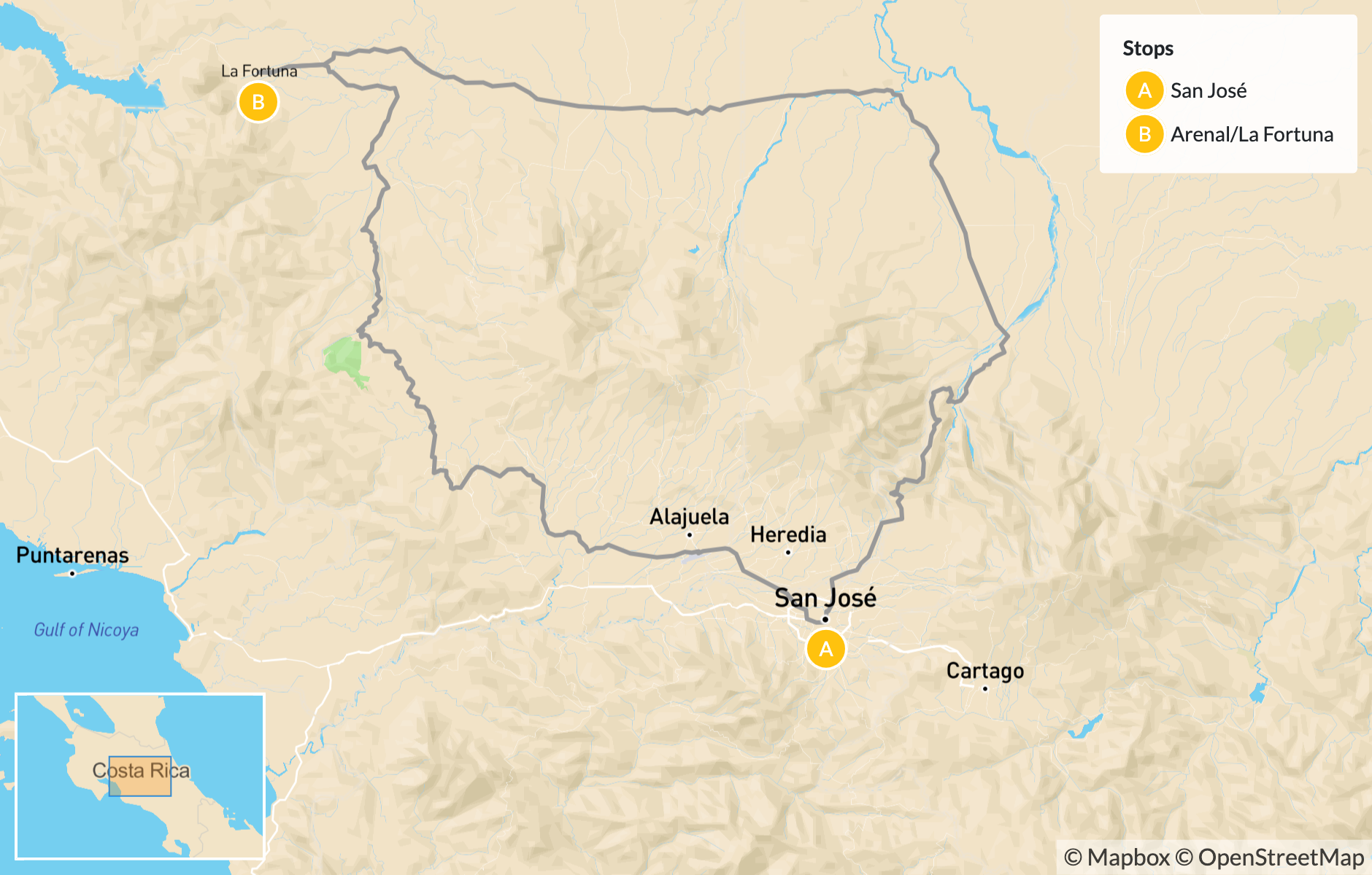 Map of Active Family Adventures & Wildlife Spotting Around Arenal Volcano – 6 Days