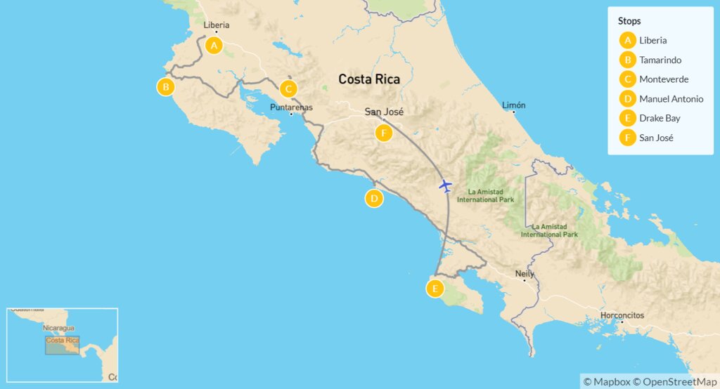 Map of Active Family Getaway to Costa Rica: Cloud Forests, Beaches, Waterfalls & Wildlife – 14 Days
