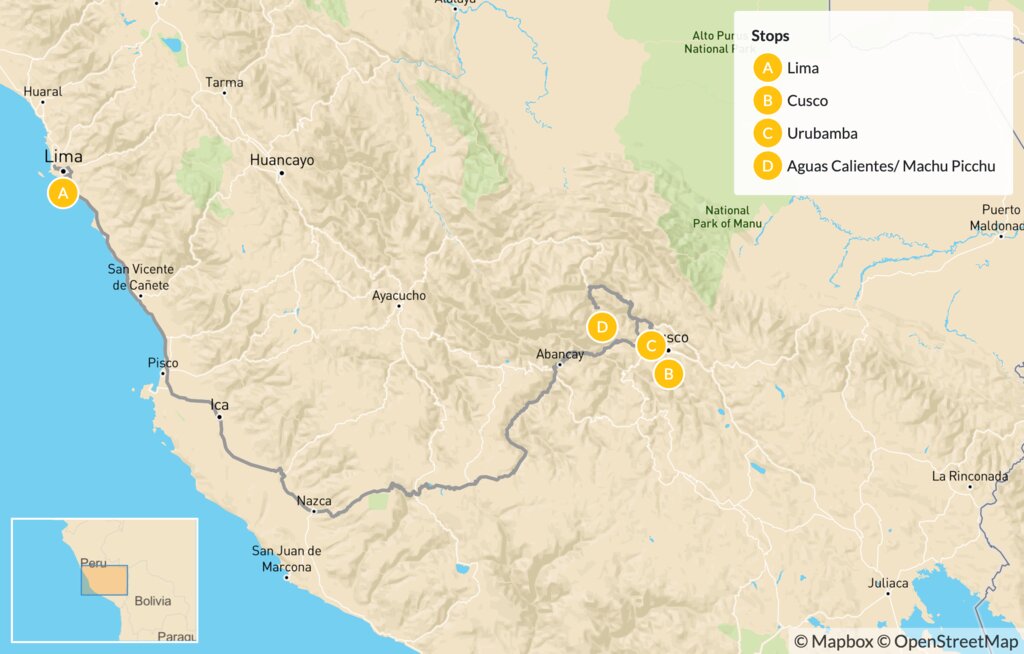 Map of Active Family Peru Adventure: Ica, Cusco & Machu Picchu – 10 Days