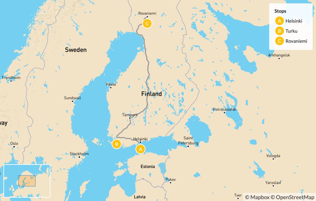 Map of Active Finland Summer Adventure: Helsinki, Turku & Rovaniemi – 10 Days
