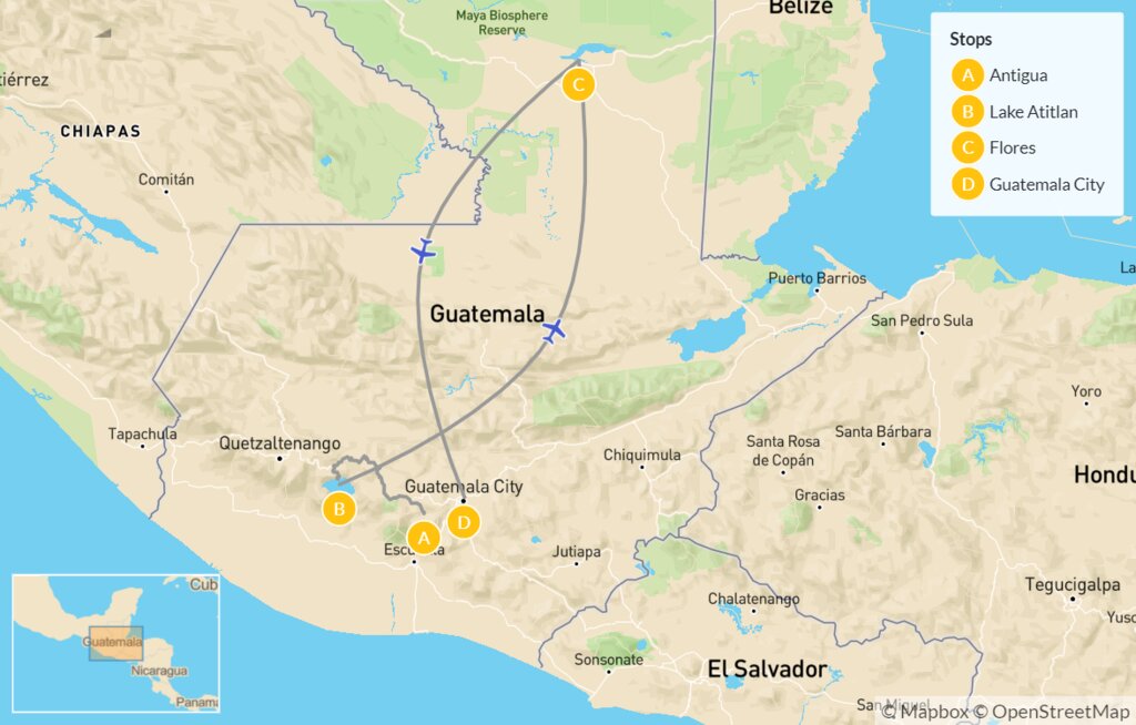 Map of Active Highlights of Guatemala: Kayaking, Hiking & Tubing – 8 Days