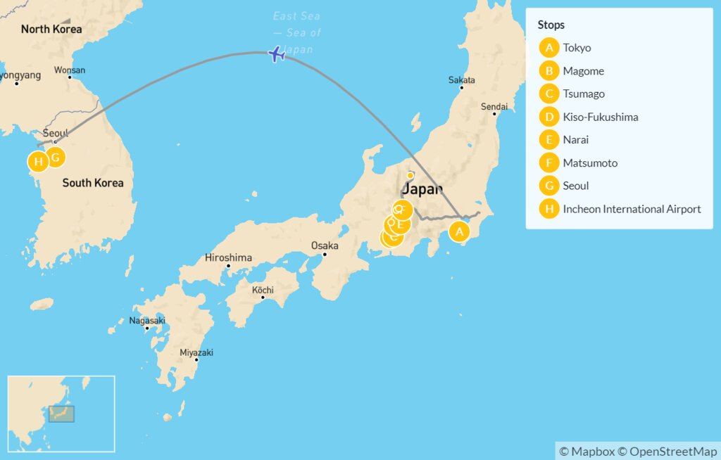 Map of Active Japan & South Korea Tour: Hike the Nakasendo Trail & Explore Seoul – 10 Days
