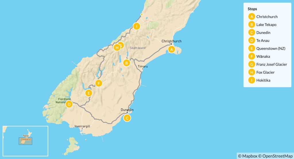Map of Active Road Trip on New Zealand’s South Island – 18 Days