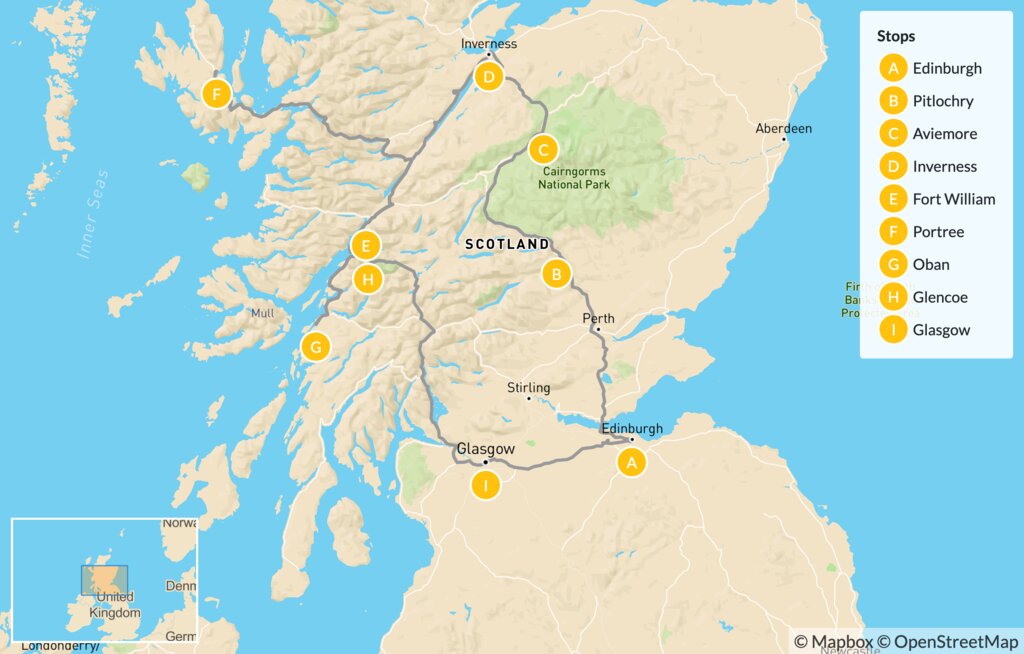 Map of Active Scotland Self-Guided Road Trip – 16 Days