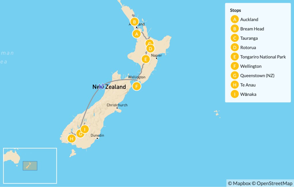 Map of Active Trekking Tour of New Zealand: North & South Islands – 19 Days
