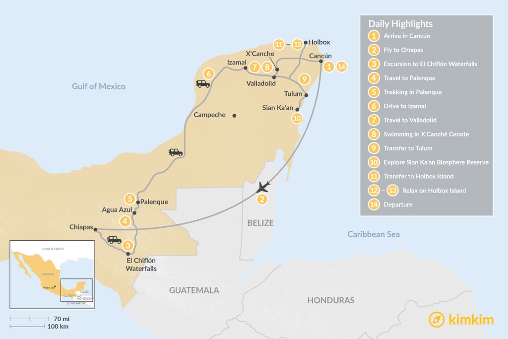 Map of Adventure in Chiapas & the Riviera Maya – 14 Days