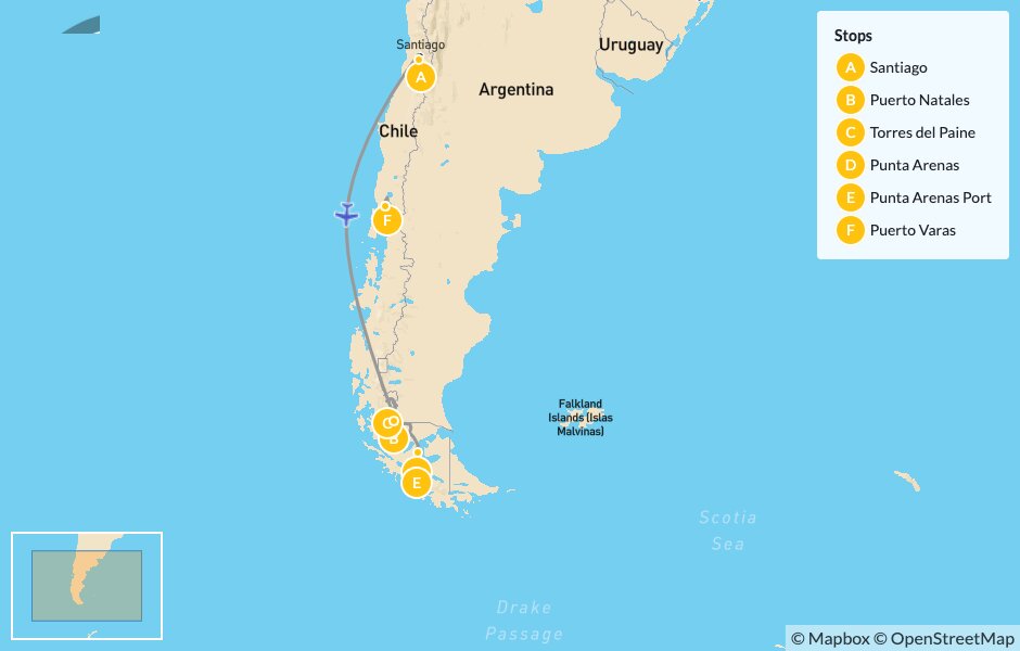 Map of Adventure in Chilean Patagonia: Torres del Paine, Strait of Magellan & Lake District – 14 Days