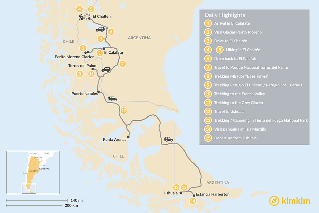 Southern Patagonia contains some of Argentina’s best natural wonders, and it’s no surprise that it is the country’s most popular area for outdoor activities. This tour starts in El Calafate, the region’s hub for seeing the glaciers of Patagonia, and then goes north to El Chaltén before heading back south to Torres del Paine National Park and ending around Ushuaia, the world’s southernmost city. By covering four distinct parts of Patagonia, this itinerary allows you to see all types of landscapes, ranging from Magellanic subpolar forests and mountains to ice fields and coastlines.