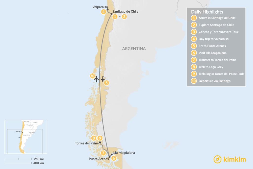 Map of Adventure in Santiago & Torres del Paine National Park – 10 Days