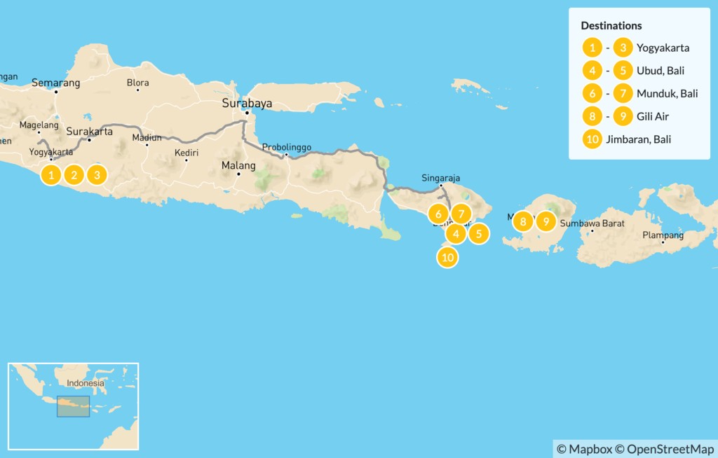 Map of Adventure & Wonder in Indonesia: Yogyakarta, Ubud, Munduk, Gili Air & Jimbaran – 11 Days