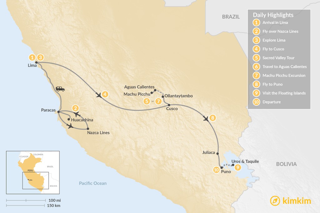 This 10-day tour combines Peru’s highlights for an active and fun getaway. Explore Lima and stroll around its bohemian sea-side neighborhoods. Go shopping for fresh produce at a local mercado before heading to a cooking class to get an authentic taste of Peru. View some of the world’s most impressive geoglyphs then try your hand at sandboarding on the nearby dunes. Next, head south to Cusco. Explore the impressive ruins of Machu Picchu, colorful textile markets, and bustling plazas of southern Peru. Embark on an exciting via ferrata and zip-lining adventure and hike to the peak of Huayna Picchu mountain for some stunning views. Finally, travel to Lake Titicaca to experience the beauty and culture of its islands.