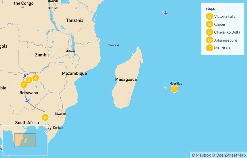 Map of Adventures in Africa: Victoria Falls, Botswana, Johannesburg & Mauritius – 14 Days