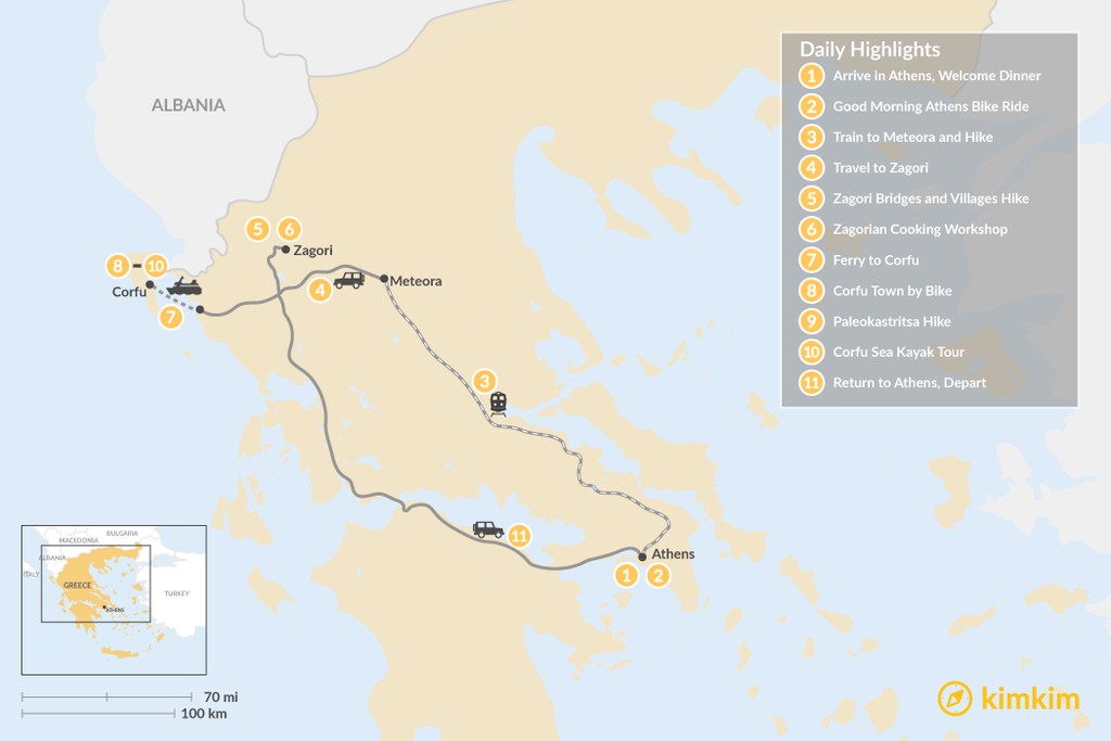 Map of Adventurous Athens, Central Greece, and Corfu – 11 Days