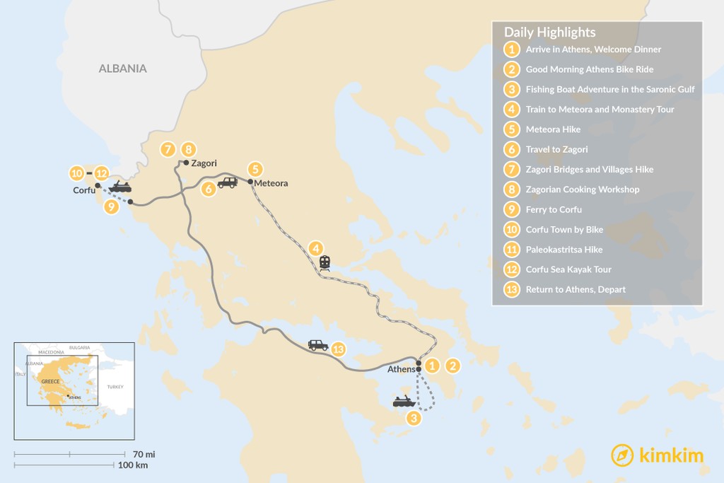 Map of Adventurous Athens, Central Greece, and Corfu – 13 Days