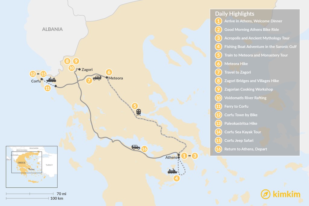 Map of Adventurous Athens, Central Greece and Corfu – 16 Days