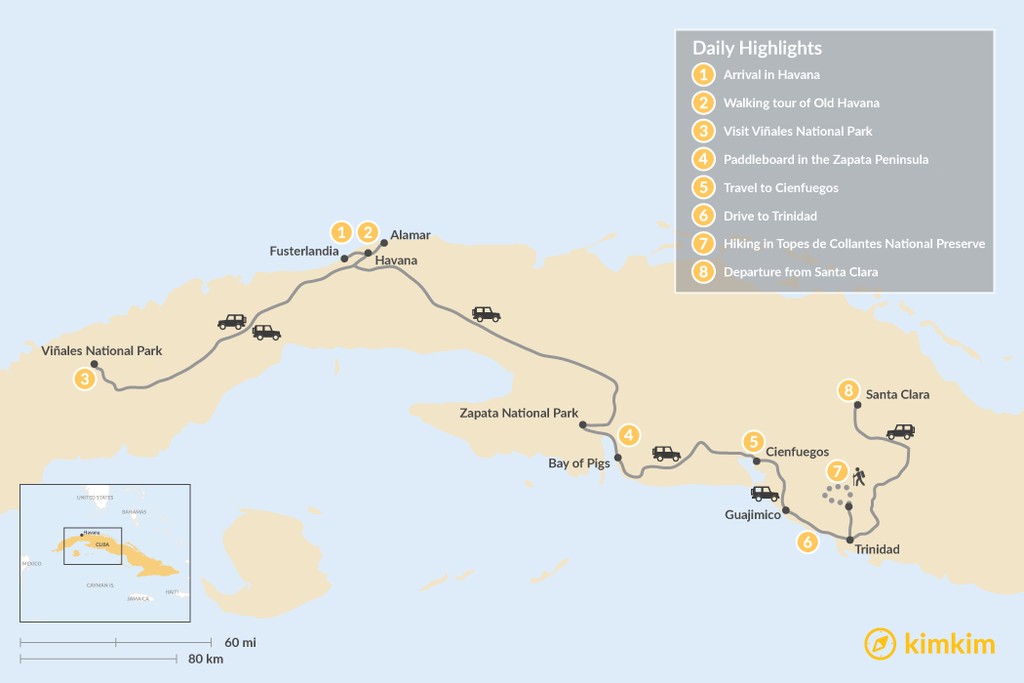 Map of Adventurous Cuba – 8 Days