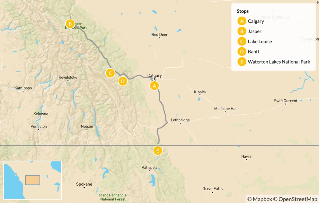 Map of Alberta Road Trip Highlights: National Parks, Wildlife & Active Adventures – 13 Days