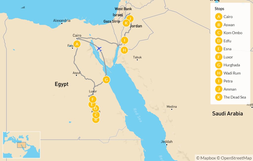 Map of Ancient Treasures & Natural Landscapes of Egypt & Jordan: From Cairo to the Dead Sea – 16 Days