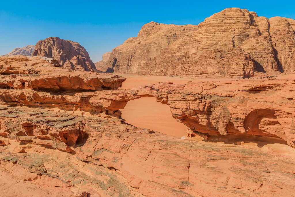 Say goodbye to Cairo and Egypt this morning as you transfer to the airport for a 1.5-hour flight to Amman, Jordan’s sprawling capital. Meet your driver at the airport and transfer four hours to Wadi Rum, often called the “Valley of the Moon” because its red sand and towering sandstone cliffs offer an otherworldly experience. When you arrive at the visitor center, meet your Bedouin guide and switch to a 4WD vehicle to traverse the rugged terrain. First, you’ll travel off-road to the Bed of the Valley of the Moon to marvel at the towering sandstone cliffs and rock formations and snap some pictures.