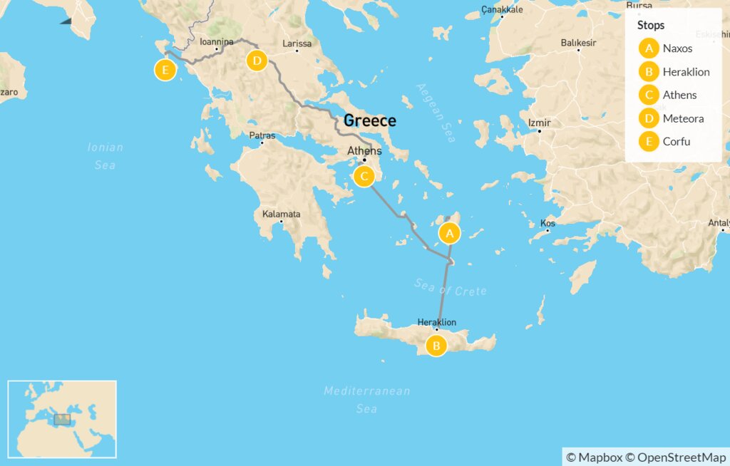 Map of Ancient Wonders & Local Culture in Naxos, Crete, Athens & Corfu – 12 Days