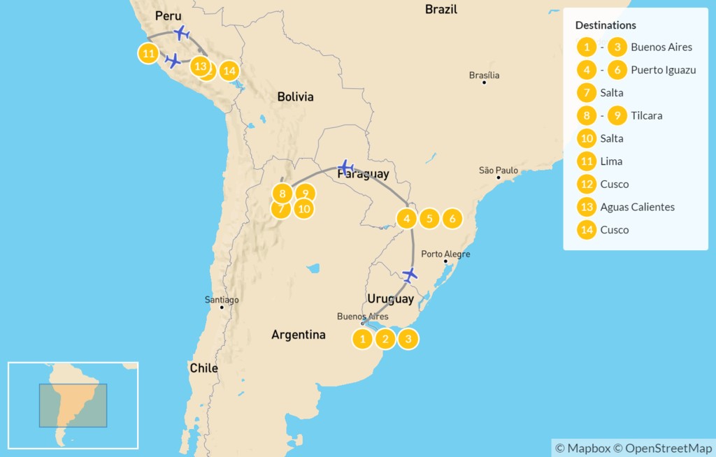 Map of Andean Adventure: Buenos Aires, Iguazú Falls, Machu Picchu, & More – 15 Days