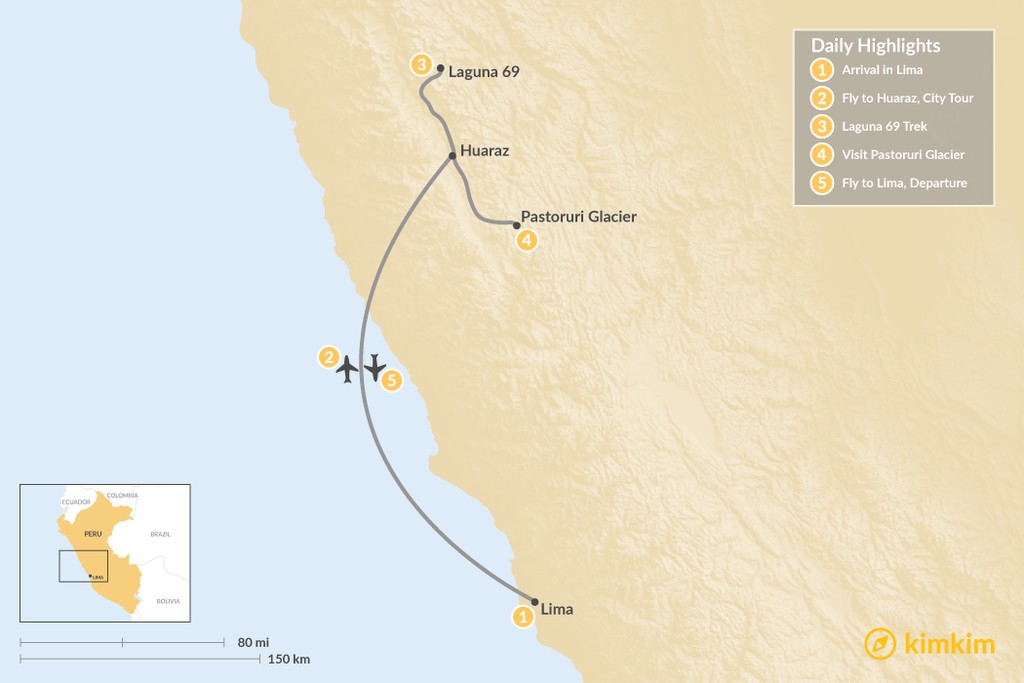 From metropolitan Lima to the remote Peruvian Andes, this 5-day adventure brings you to the heart of the mountains. Start in Lima— the capital of Peru—then take a quick flight to Huaraz, a mountain town popular with outdoor enthusiasts. Spend a day exploring the city’s history, then head into the mountains to see stunning glaciated peaks, bright blue mountain lakes, and Peru’s highest mountain—Mt. Huascaran, which towers at 22,205 ft.