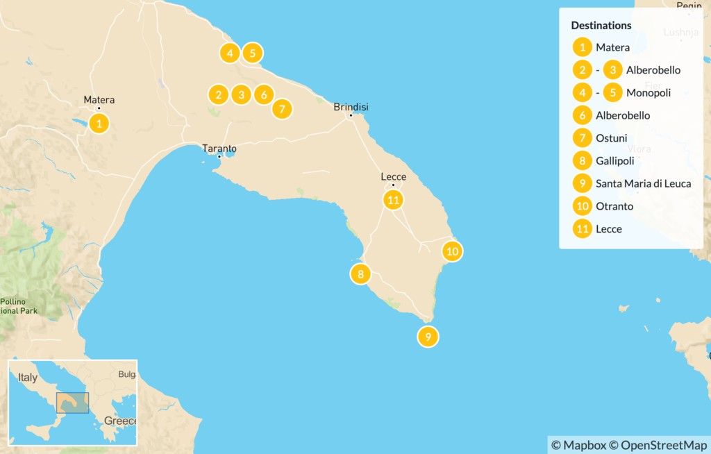 Active travelers will get a full dose of sea and countryside views as they bike their way through southern Italy. Begin in the prehistoric town of Matera, then pick up your bike and ride to the whimsical settlement of Alberobello with its conical trulli houses. Sample local wines and culinary delights in Cisternino, then soak up some sun in charming beach towns on the Adriatic like Monopoli, Gallipoli, and Polignano a Mare. End your trip with excursions to spectacular grottos, and stroll past Baroque architecture and Roman ruins in Ostuni, Otranto, and Lecce.
