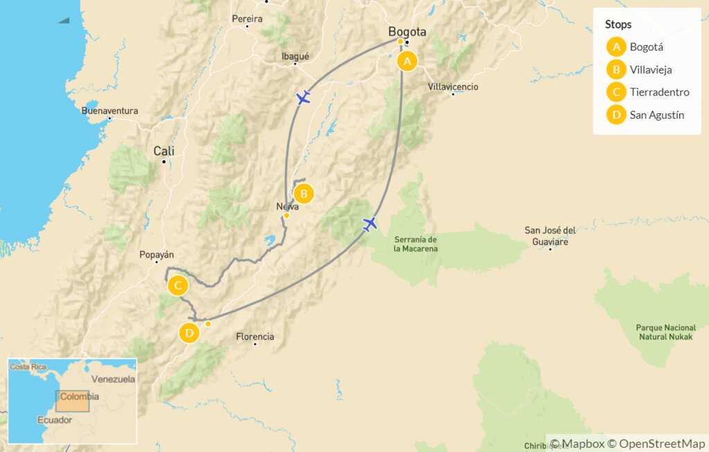 Map of Archaeology, Nature & Coffee of Southern Colombia – 10 Days