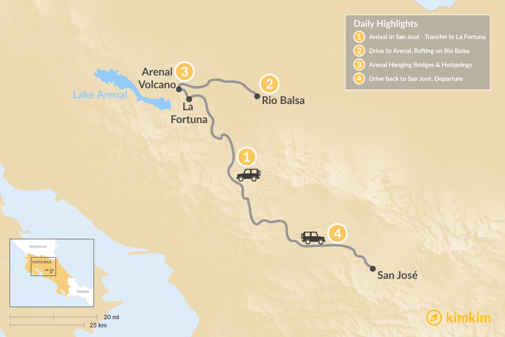 Map of Arenal Waterfall Expedition – 4 Days
