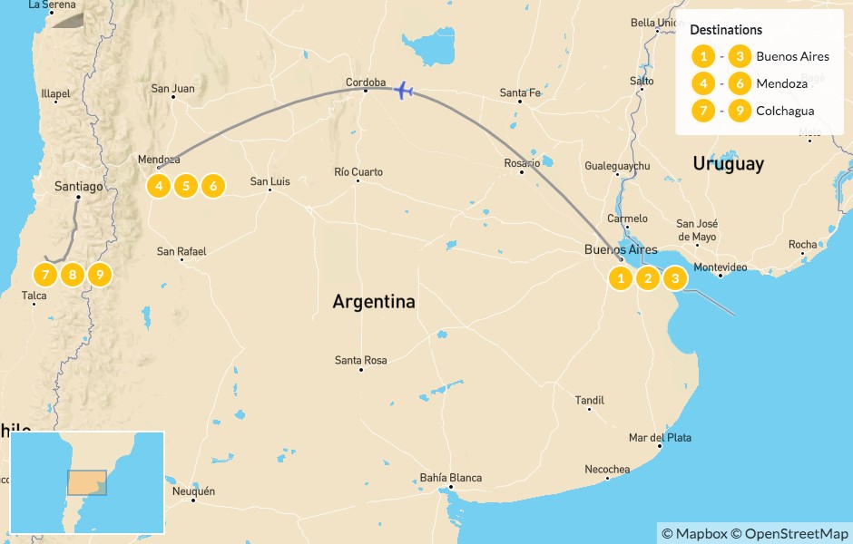 Map of Argentina & Chile Vineyard Honeymoon: Buenos Aires, Mendoza & Colchagua – 10 Days