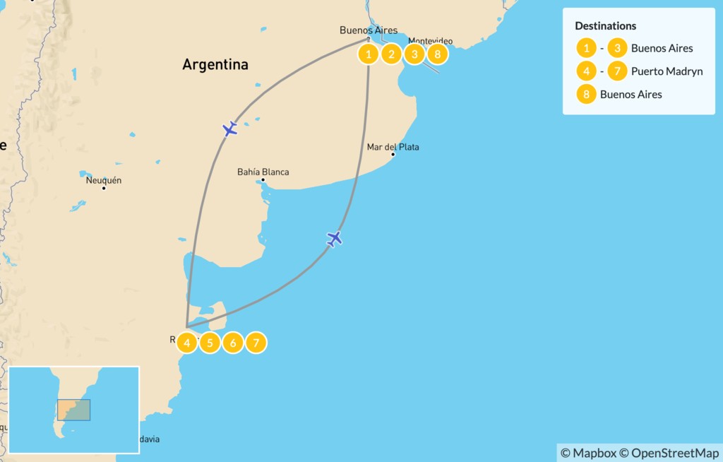 | Day 4 | Fly from Buenos Aires to Puerto Madryn | Puerto Madryn |