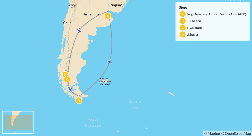 Map of Argentine Patagonia Day Hike Adventure: El Chaltén, El Calafate & Ushuaia – 11 Days