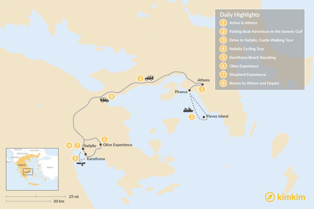 Live like a local in Greece’s idyllic Argolic Gulf with this active 8-day itinerary. You’ll explore Athens for a few days and even hop onboard a fishing boat with an expert fisherman before you head to seaside Nafplio, home to winding streets and a historic water fortress. Explore this beautiful area of mainland Greece via foot, bicycle, and kayak, then get hands-on in an olive grove and try shepherding for a day.