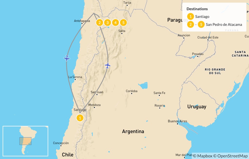 | Day 2 | Santiago to San Pedro de Atacama | San Pedro de Atacama |