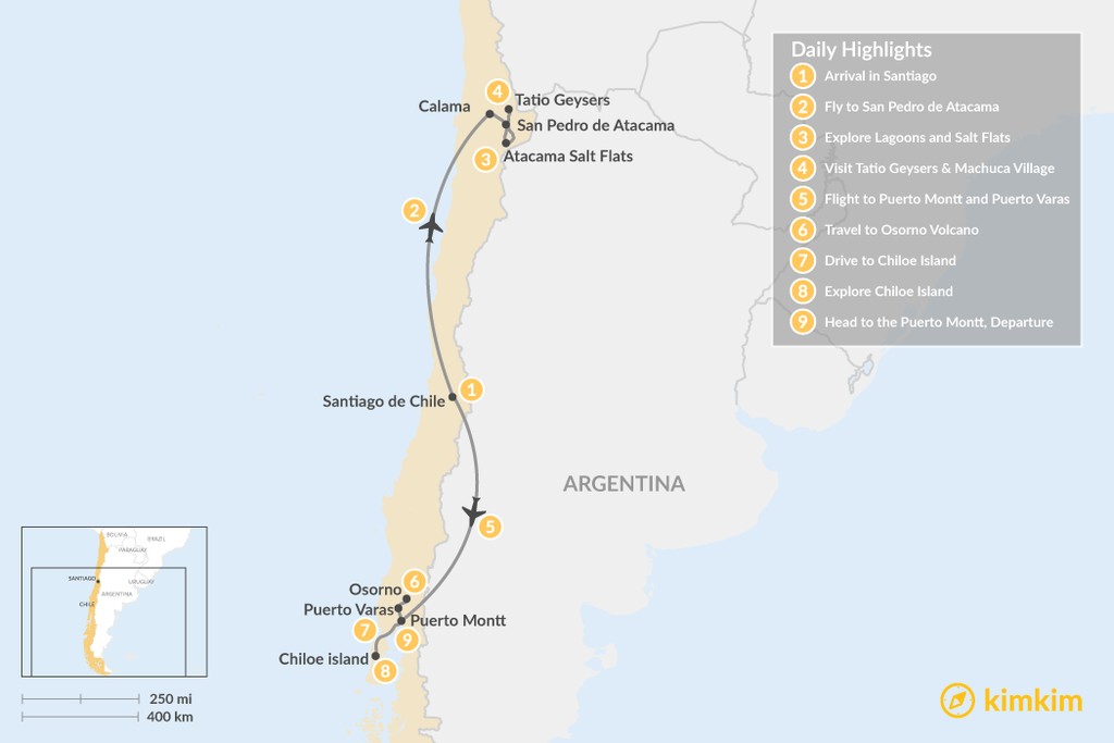 | Day 5 | San Pedro de Atacama – Santiago – Puerto Montt – Puerto Varas | Puerto Varas |